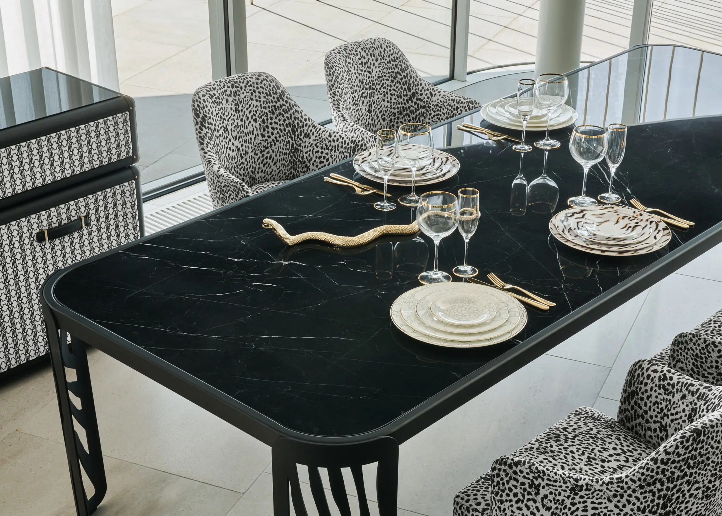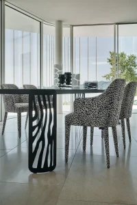 Miwi is a chair with soft and welcoming shapes. Its linear and contemporary design is enlivened by the upholstery in the iconic fabrics of the Roberto Cavalli Home Interiors collection.