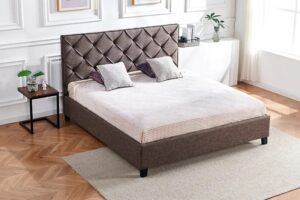 - Type: Bed frame — mixed fabric and PU with deep button tufting