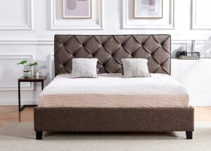 - Type: Bed frame — mixed fabric and PU with deep button tufting design